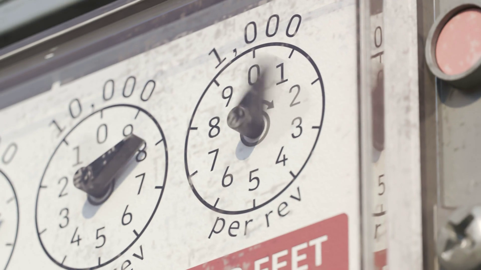 A gas meter gauges in closeup camera. Fast fuel flow shown in a