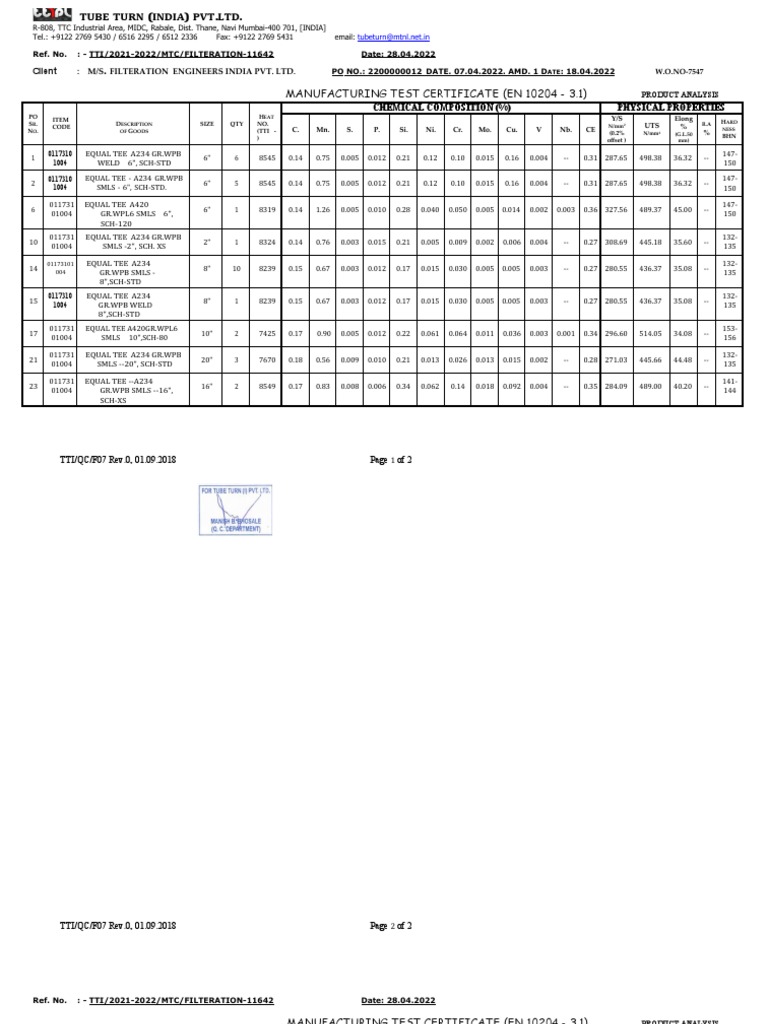 Manufacturing Test Certificate (En 10204 3.1) M/S. Filteration Engineers India Pvt. LTD PDF