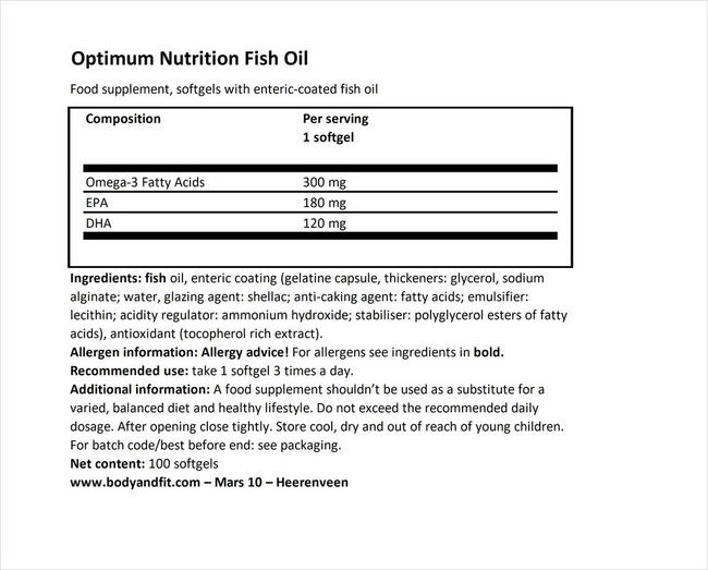 Optimum Nutrition Fish Oil 100 Softgels Buy Optimum Nutrition Fish Fish Oil Nutrition Per 100G The favorite choice for the term fish oil is 1 teaspoon serving of cod liver fish oil which has about 40. 2 softgels of fish oil ( nature made) contains 16 calories. the exact link to the food presented on this page can be found below. The macronutrient breakdown is 0% carbs,. The macronutrient breakdown is 0% carbs,. Fish Oil Nutrition Per 100G.