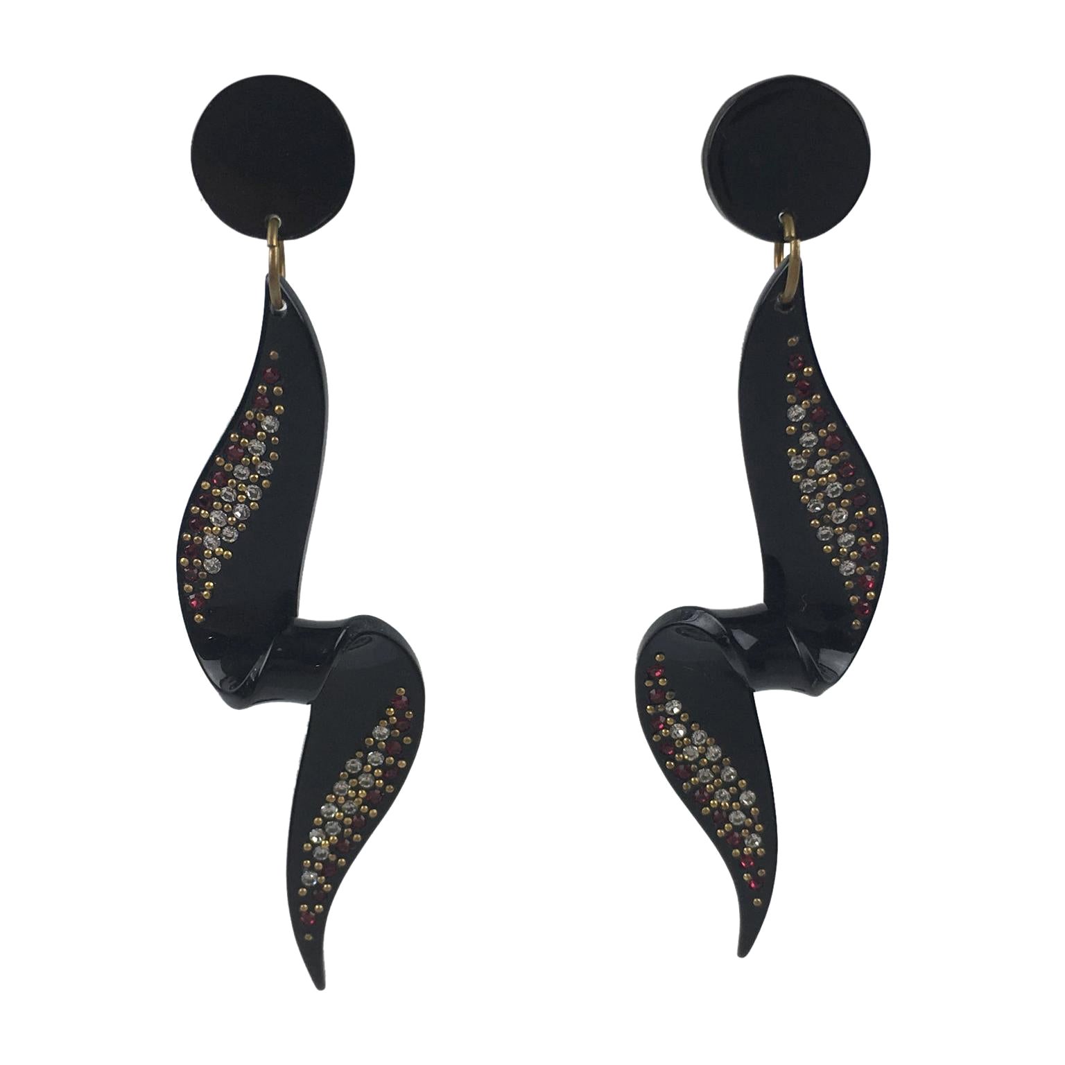Black Navette Rhinestone Long Dangle Clip Earrings For Sale at 1stDibs