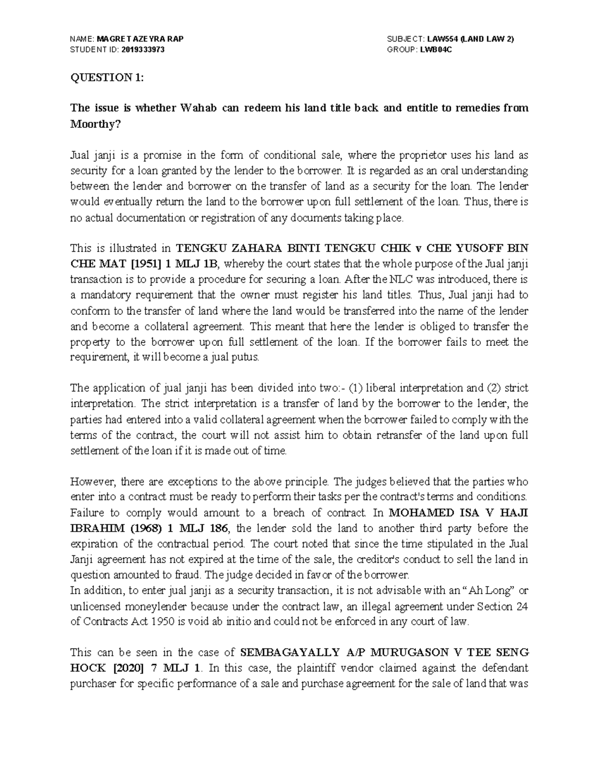 LAW 554 LAND LAW 2 Final QUESTION 1 The issue is whether Wahab can