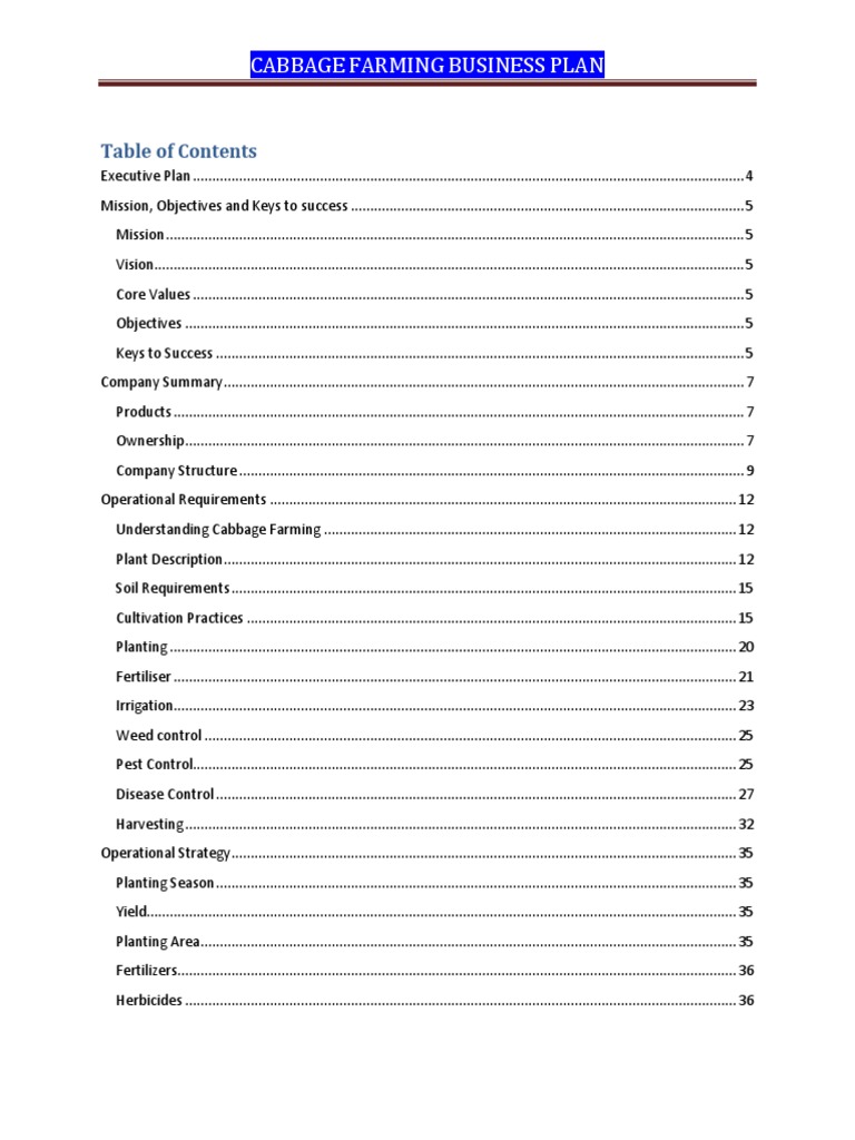 Cabbage Farming Business Plan Content Page PDF Agriculture Finance (General) Cabbage Farming Business Plan (Pdf) Why write a business plan for a cabbage farm? What tool should i use to write my cabbage farm business plan? Complete a cabbage farming training. How do i build a financial forecast for a cabbage farm? This document outlines a business plan for starting a cabbage farming operation. What information is needed to create a business plan for a. Cabbage Farming Business Plan (Pdf).
