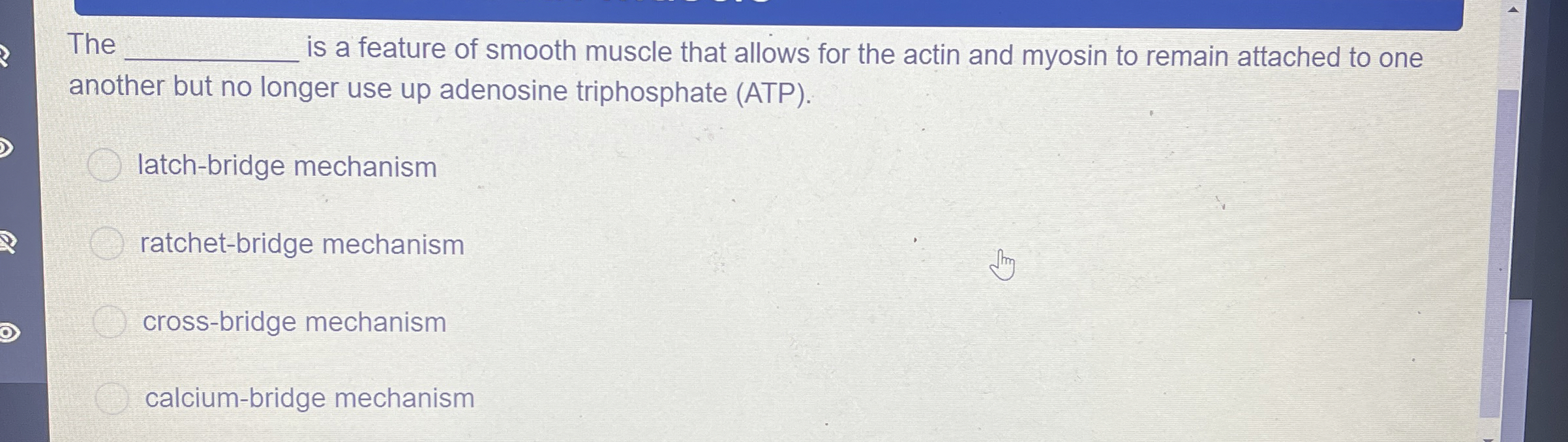 Solved The q, is a feature of smooth muscle that allows for Latch-Bridge Mechanism Smooth Muscle Smooth muscle cells also develop tonic and phasic contractions in response to changes in load or length. Smooth muscle can be stimulated by pacesetter cells, by the autonomic nervous system, by hormones, spontaneously, or by stretching. Even as levels of phosphorylated myosin light. It describes the unique way in which smooth. It has been observed that smooth muscle can maintain. Latch-Bridge Mechanism Smooth Muscle.