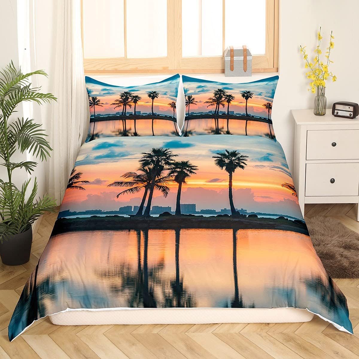 Greneric Palm Tree Duvet Cover, Atoll Lake Bed Linen Set, Miami Florida