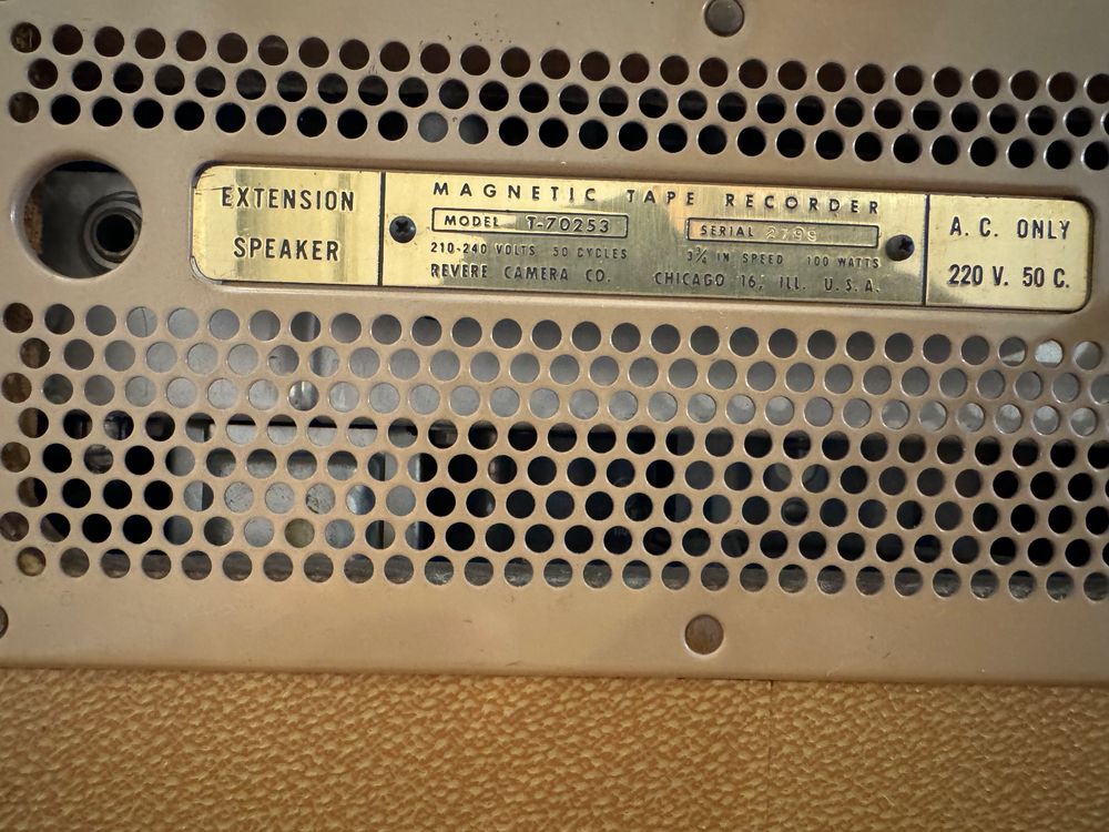 Vintage 1950's Revere Tape Recorder Revere Magnetic Tape Recorder Manufactured by the revere camera co. Reel to reel type, single speed, monaural, tone control, vu indicator, 3 external jacks = micro in, phono out, & extension. 3 3/4 and 7 1/2 ips. Manufactured by the revere camera co. We tested this recorder as best we can, and it. Reel to reel type, single speed, monaural, tone control, vu indicator,. Revere Magnetic Tape Recorder.