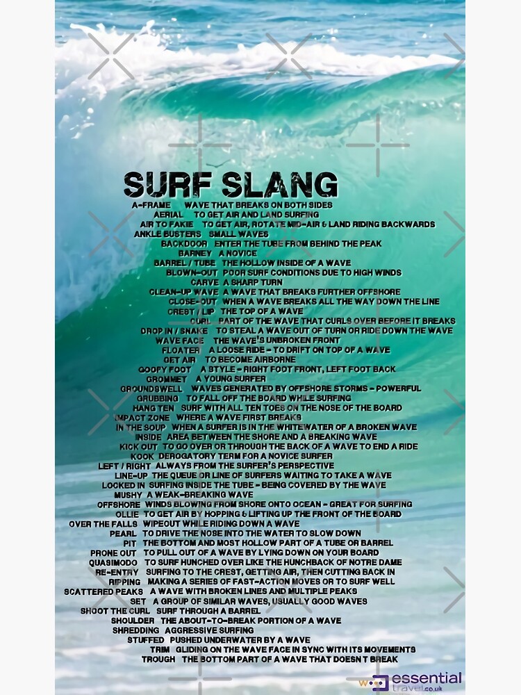 Surfing Slang MegaList 127 Surf Lingo Terms Every Surfer Should Know… Surf Slang Poster Unique surfing slang posters designed and sold by artists. In this guide to surfer slang, we’ll show you the most common surf terms so you don’t sound like a kook out in the water. Unique surf slang posters designed and sold by artists. With unique surfing terms to explain everything imaginable, it's become almost a dialect in its own right.. Surf Slang Poster.