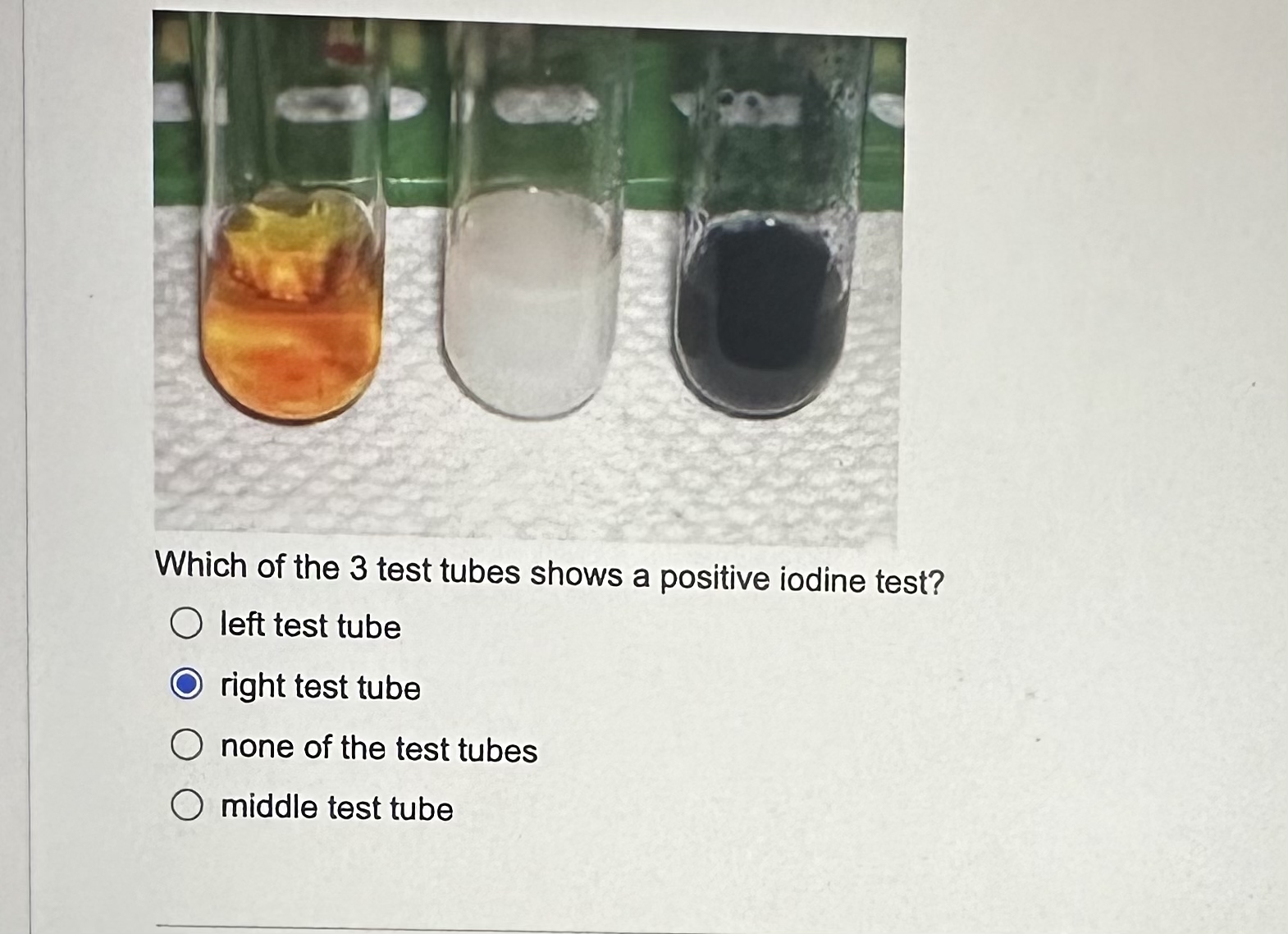 Which of the 3 test tubes shows a positive iodine