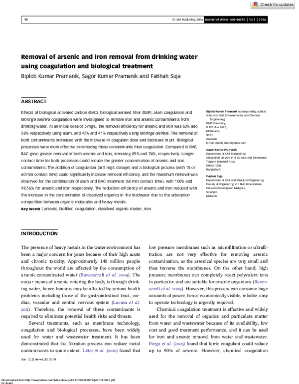 (PDF) Removal of arsenic and iron removal from drinking water using coagulation and biological