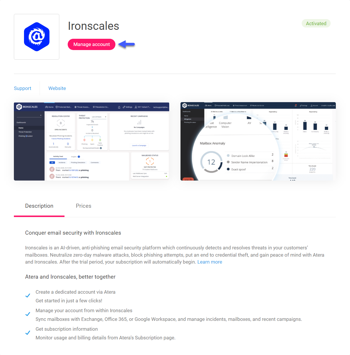 Atera and Ironscales Atera Support