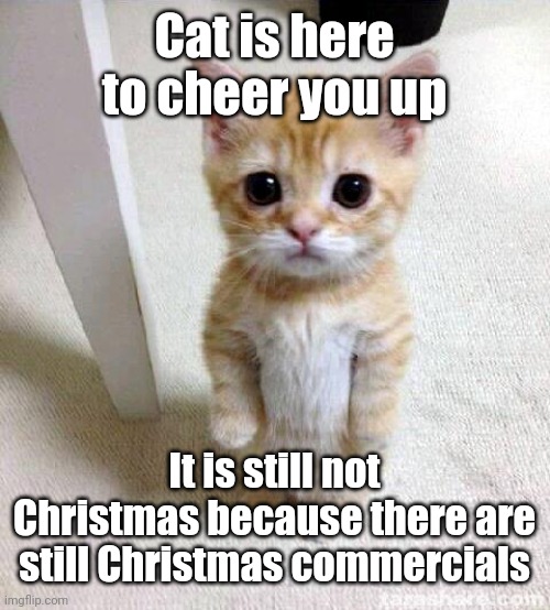 Cat is here to cheer you up Imgflip Cat Christmas Commercial An experiment in holiday destruction begins as a tarp is lifted from an enormous pile of holiday food and decorations, exposing it to dozens of cats peering through doggie doors. When this curious boy shakes a gift that was nestled under the tree, a group of cats comes running after him. Dans ta pub temptations cat treats christmas. About press. Cat Christmas Commercial.