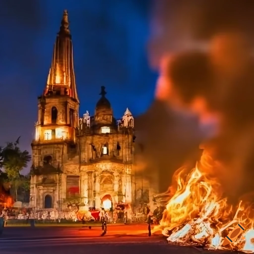 Night view of a burning city with zombies in guadalajara, mexico