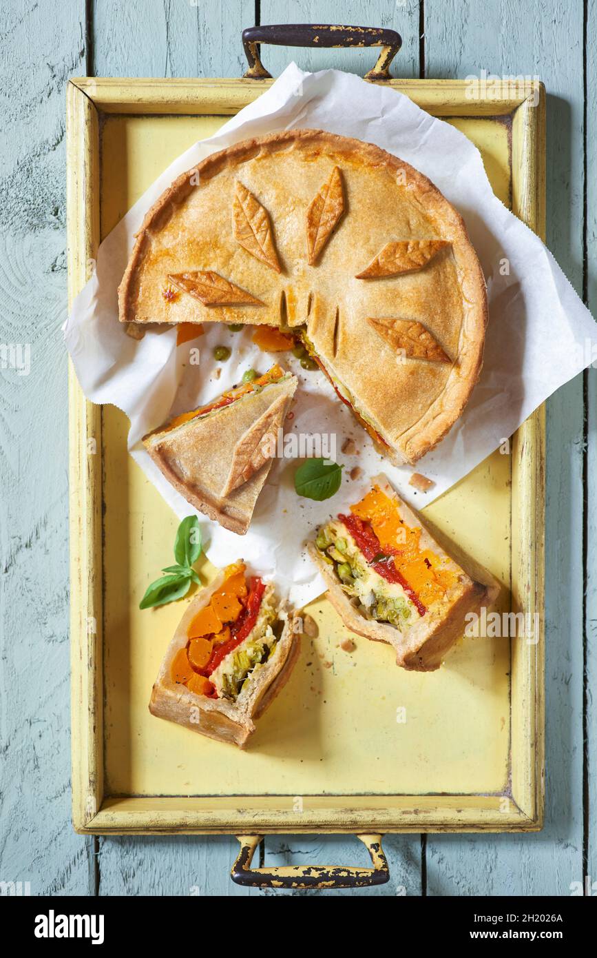 Vegetable pie with pastry leaves, sliced Stock Photo Alamy