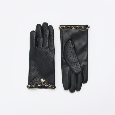 Black chain detail faux leather gloves River Island