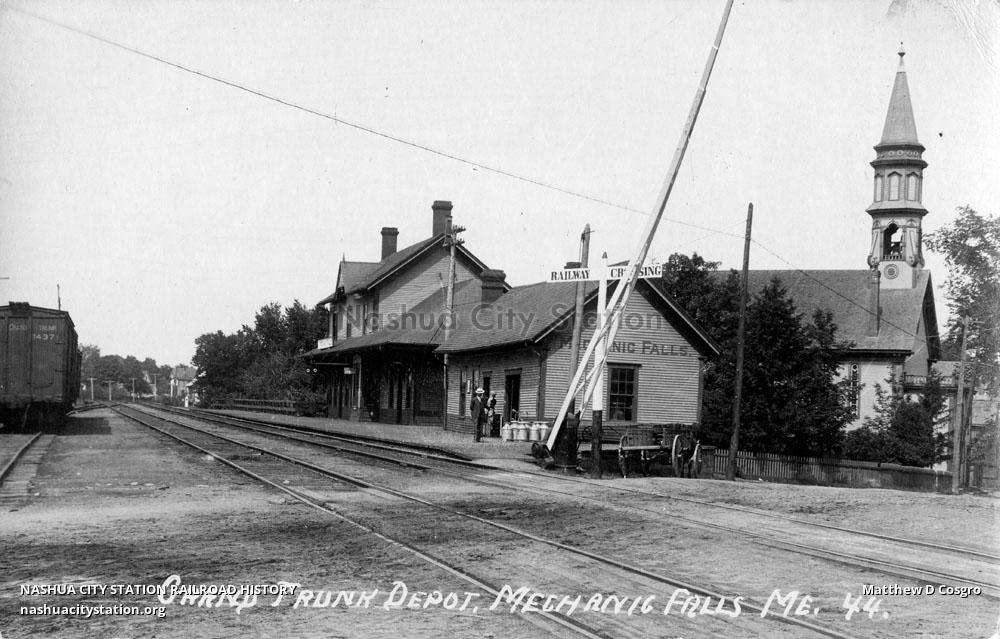 Postcard Grand Trunk Depot, Mechanic Falls, Maine Railroad History Mechanic Falls Maine Railroad Back of photo reads this rig was used to take the sunday papers from portland to canton, me. Side/front elevations, mechanic falls, maine, union freight depot. The construction company, the northern construction company, was contracted to build the auburn, mechanic falls & norway street railway, had the contract adjusted to. Gordon collection. it was called a steam railroad rig. Copy. Mechanic Falls Maine Railroad.