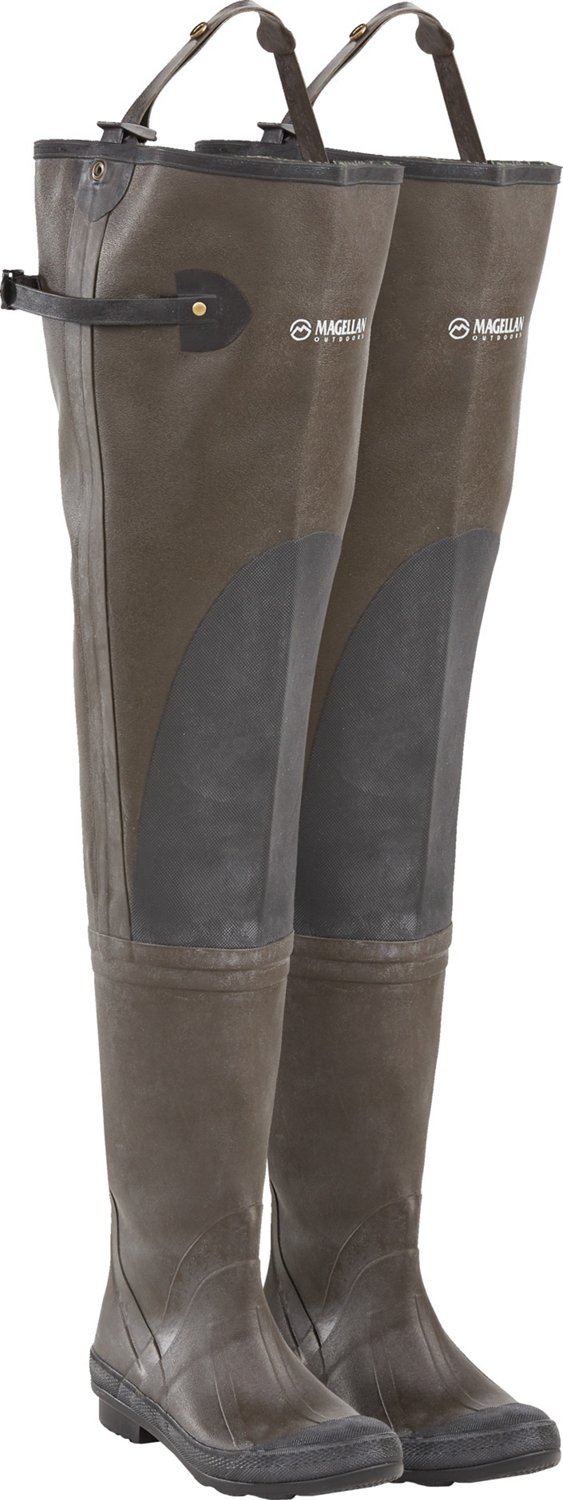 Magellan Outdoors Men's Rubber Hip Boots Academy Mens Rubber Hip Boots Whether on the farm, in the field or around the jobsite, our hip boots are made with the premium rubber that we've been perfecting for over 100. Manufactured with a vulcanized rubber construction, these 40 hip boots have a flexible outsole. Real innovation, unmatched depth and breadth of products, exceptional fit for all sizes, broad selection, comfort, dryness and value. Mens Rubber Hip Boots.