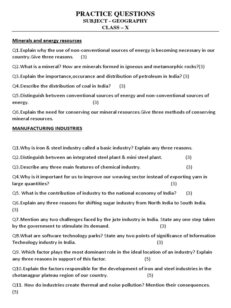 Practice Questions Subject Geography Class X PDF Industries