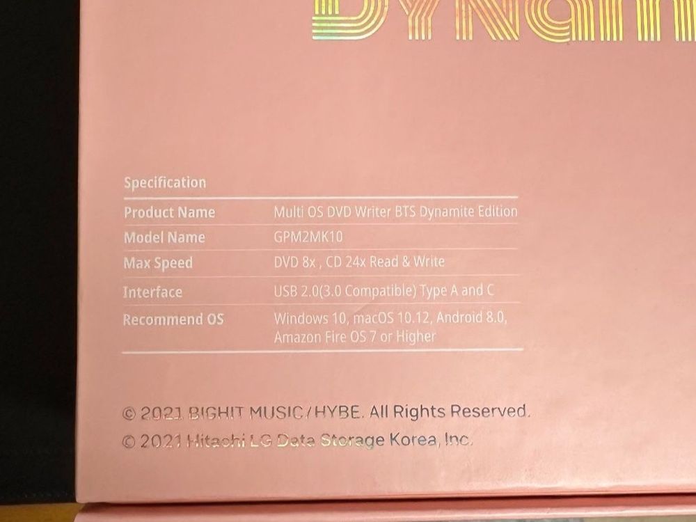 HitachiLG BTS Dynamite Multi OS DVD writer GPM2M (Fire, Android Hitachi-Lg Bts Dynamite Multi Os Dvd Writer - Gpm2M Bts dynamite theme dvd writer. Bts dynamite collaboration dvd drive. Bts dynamite multi os dvd writer. 'bts dynamite multi os dvd writer' is a device that can play cds or dvds directly on various smart devices when downloading exclusive apps, and supports windows pc and mac. Hitachi-Lg Bts Dynamite Multi Os Dvd Writer - Gpm2M.