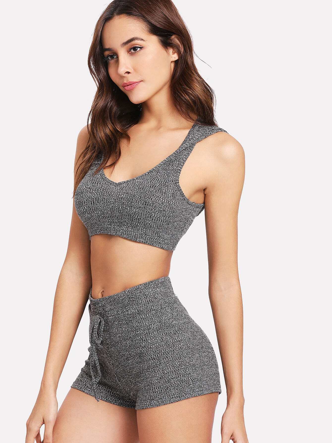 Marled Hoodie Sports Bra & Drawstring Shorts Set SheIn(Sheinside)