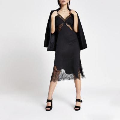 Black lace satin midi slip dress River Island