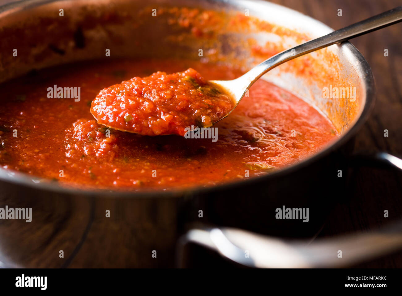 Tomato Sauce with Spoon in Metal Pan Stock Photo Alamy