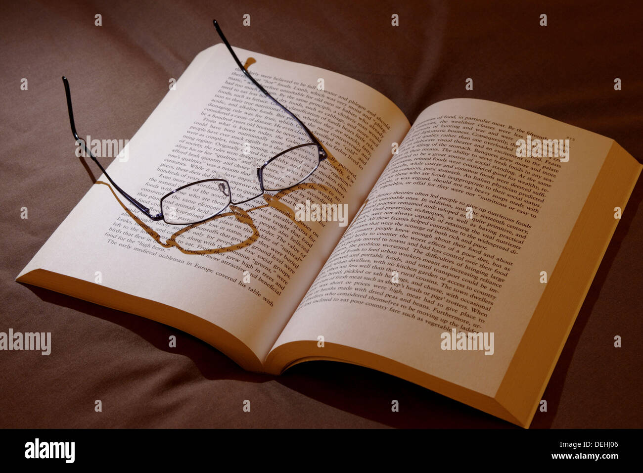 Glasses and reading book on bed Stock Photo Alamy