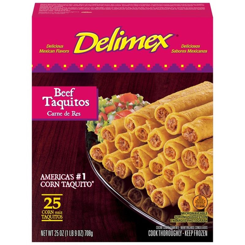 Delimex Beef Corn Taquitos Frozen Snacks, 23 ct Box Delimex Taquitos Beef From your freezer to your plate in minutes! Delimex taquitos can be prepared in the microwave, oven or air fryer, and are ready in minutes. our taquitos are made with shredded beef with red bell peppers, green bell peppers, jalapeños and melty colby cheese and wrapped in a crispy tortilla. Our taquitos are made with shredded beef and seasoned. Delimex Taquitos Beef.
