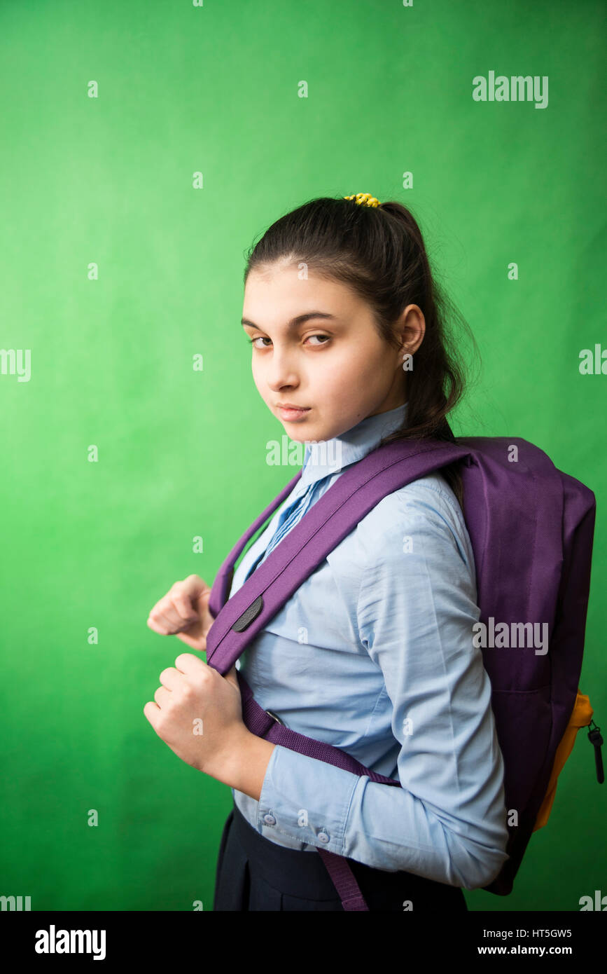one teen schoolgirl in blue shirt is standing with a purple backpack on