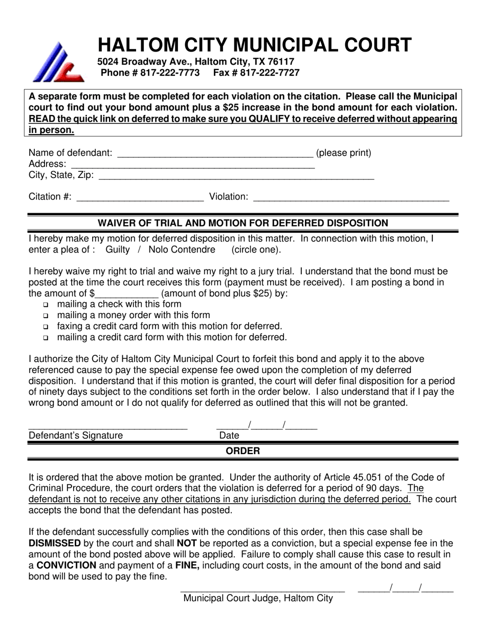 Haltom City, Texas Waiver of Trial and Motion for Deferred Disposition