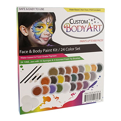 24 Color Pro Face Paint Color Set. Large 10ml Jars with Applicator Kit