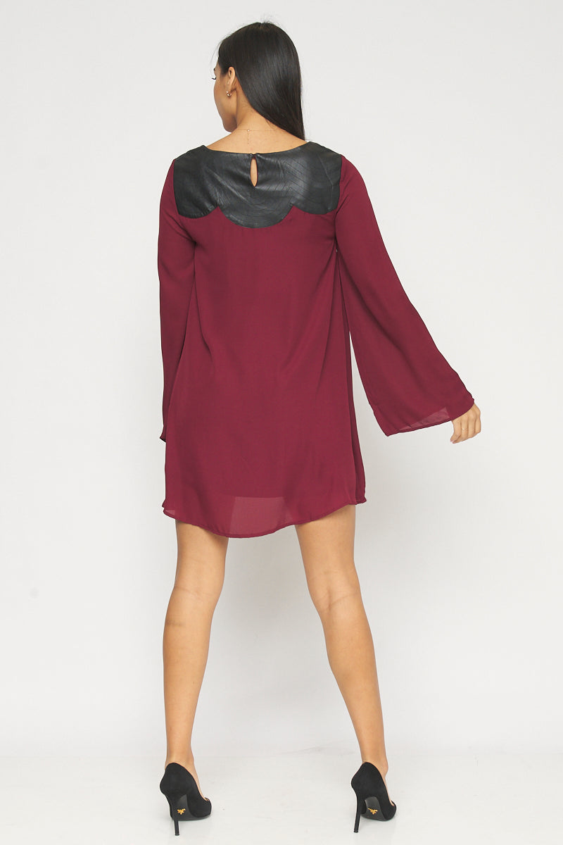 Long Bell Sleeve Dress with Boat Neck and Faux Leather Contrast Back