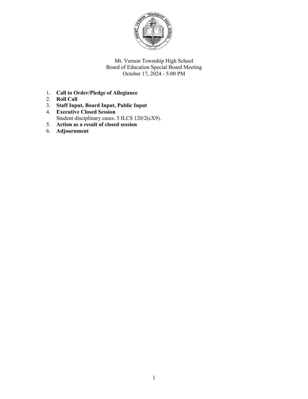 Mount Vernon Township High School Board of Education to hold Thursday