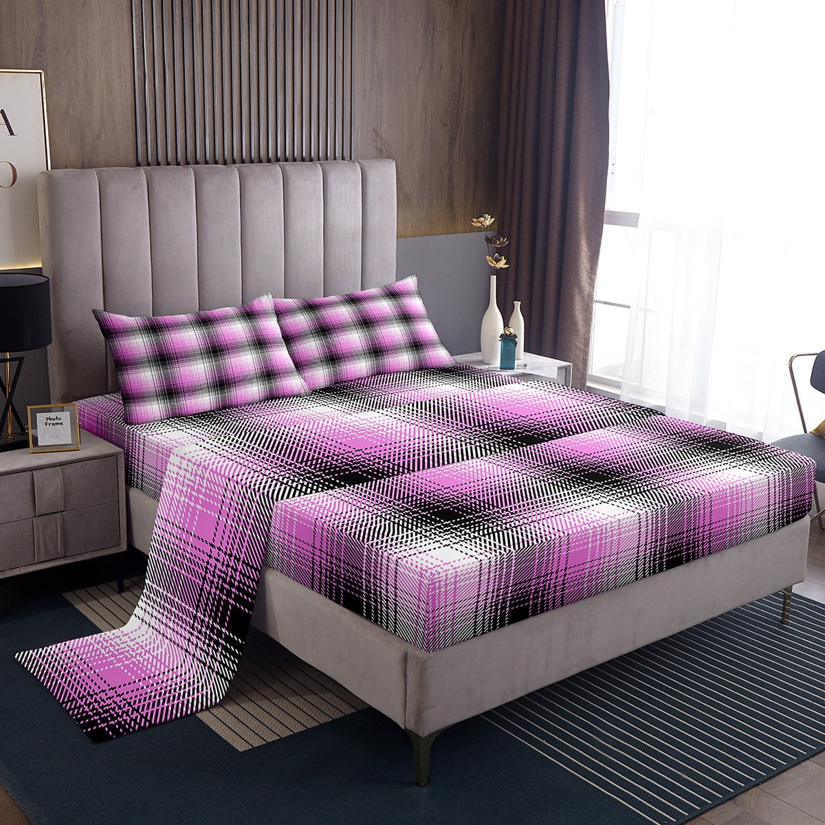 YST Girls Black White Pink Bedding Set Queen Abstract Geometric Plaid