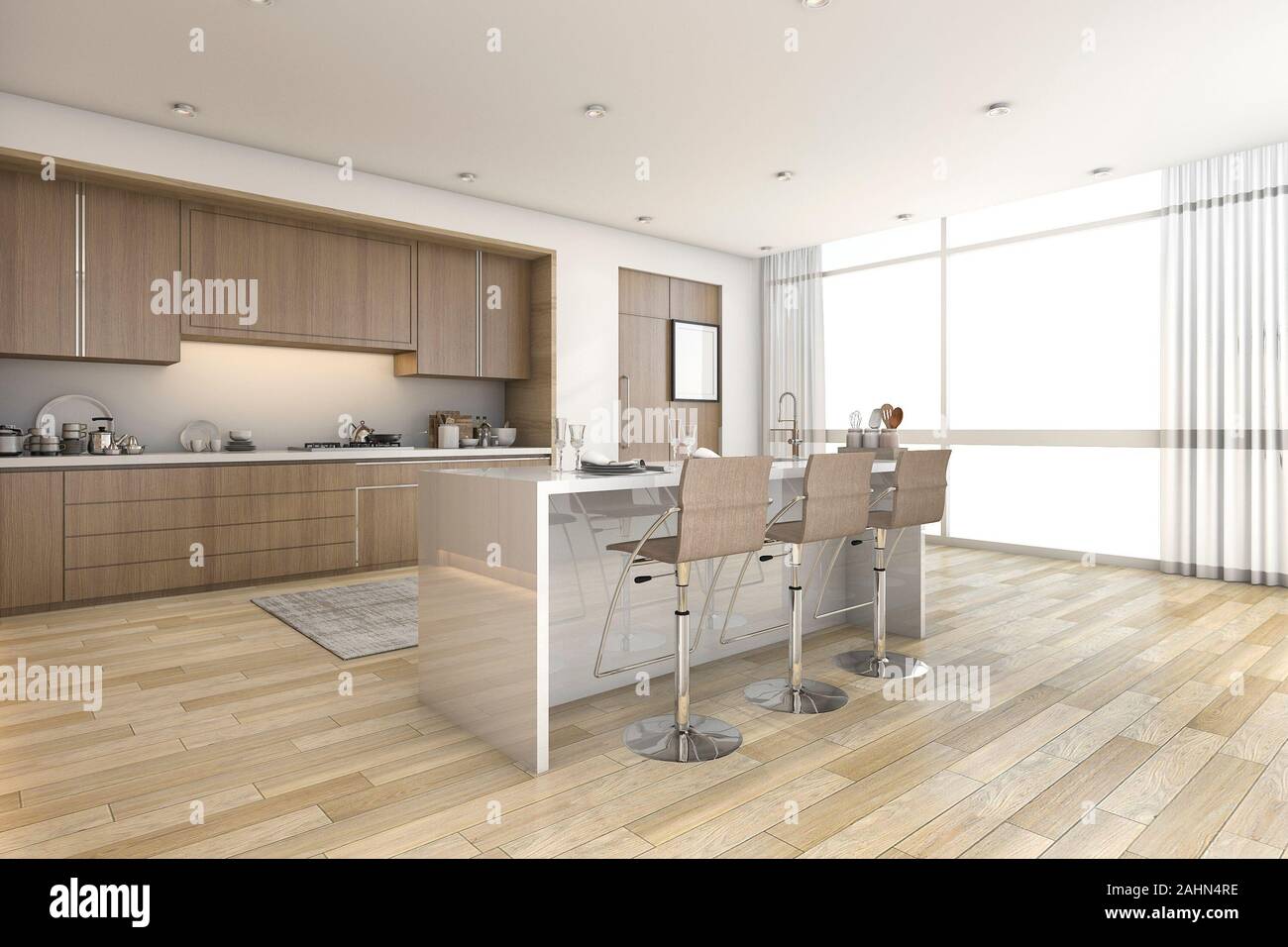 3d rendering wood bar kitchen near window Stock Photo Alamy