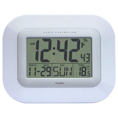 Radio Controlled LCD Wall Mountable and Desk Clock YC8021 Youshiko Radio Controlled Lcd Clock Clock can be hung on a wall or on a desk or surface. It has two independent atomic 24/12 hour clocks with exclusive utc time zone and a dedicated station ten minute id timer. Youshiko large jumbo lcd radio controlled (uk & ireland version/premium quality/clear display) silent wall & desk clock, helpful for dementia. Clock can be set on standard. Radio Controlled Lcd Clock.
