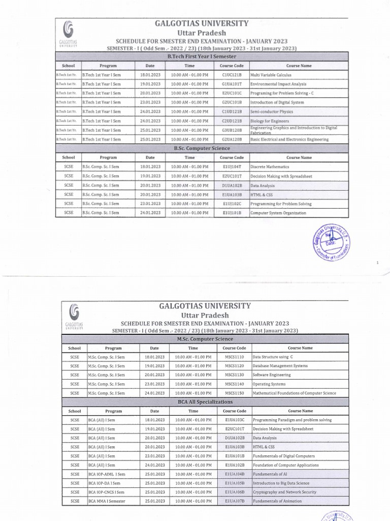 Datesheet Semester End Examination (First Semester) January 2023
