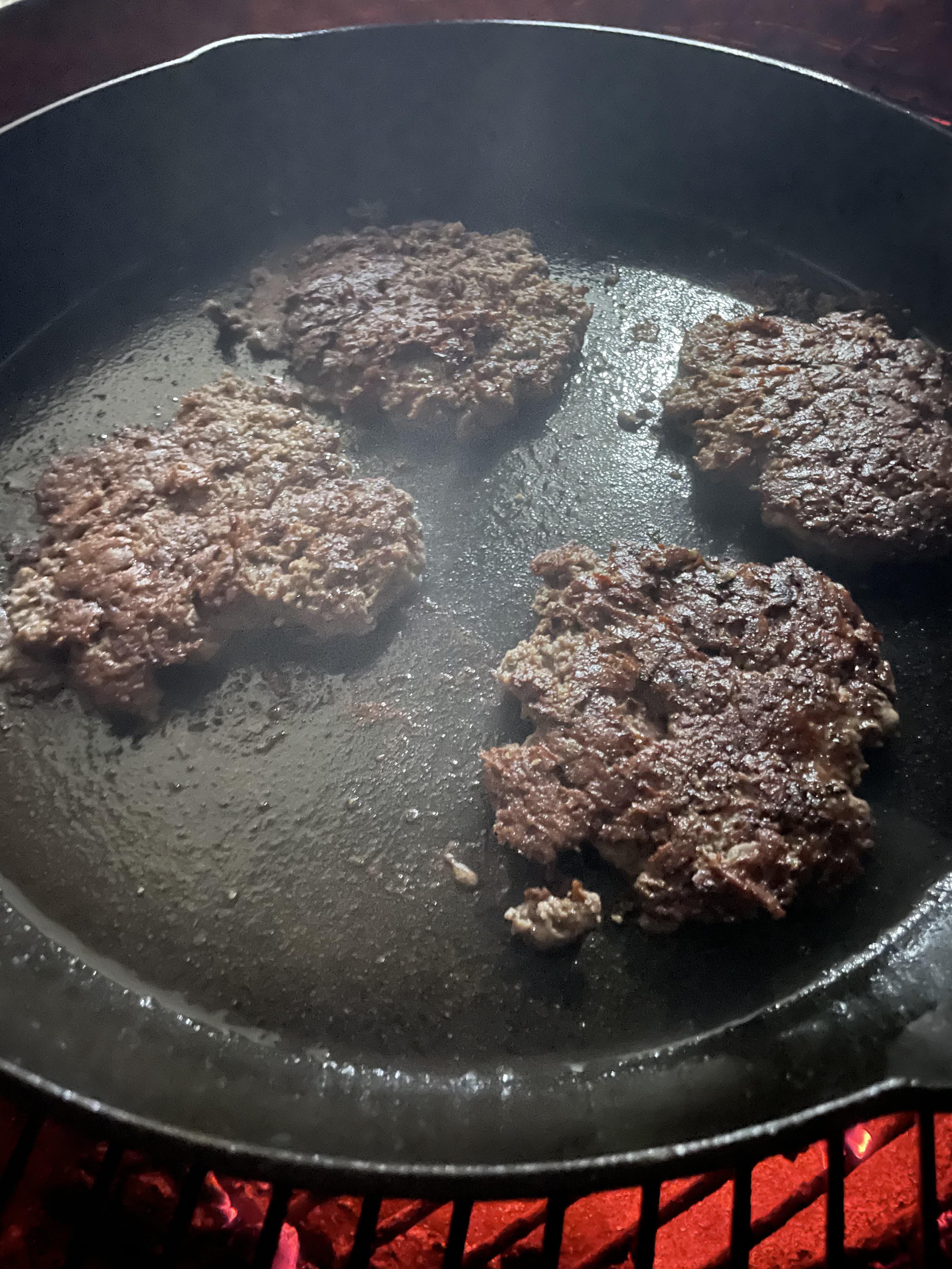 Smash burger success. Cast iron skillet on the er kettle. webergrills