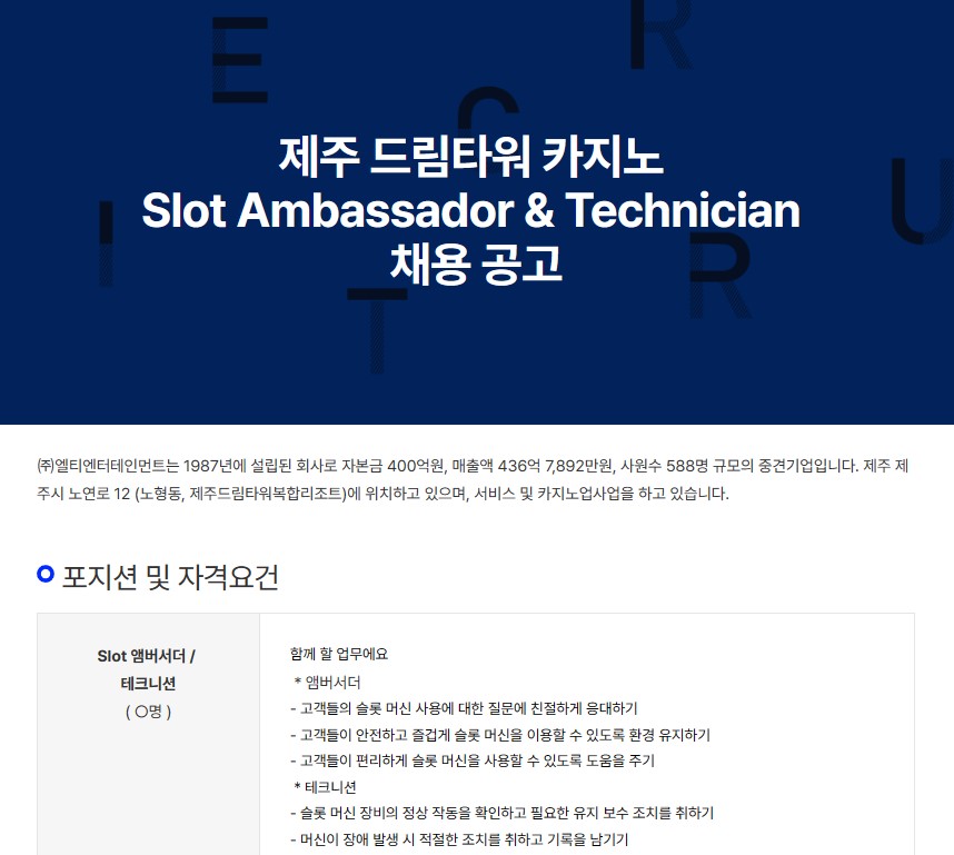 [제주 드림타워 카지노] Slot Ambassador / Technician 직원 채용 서울카지노딜러아카데미