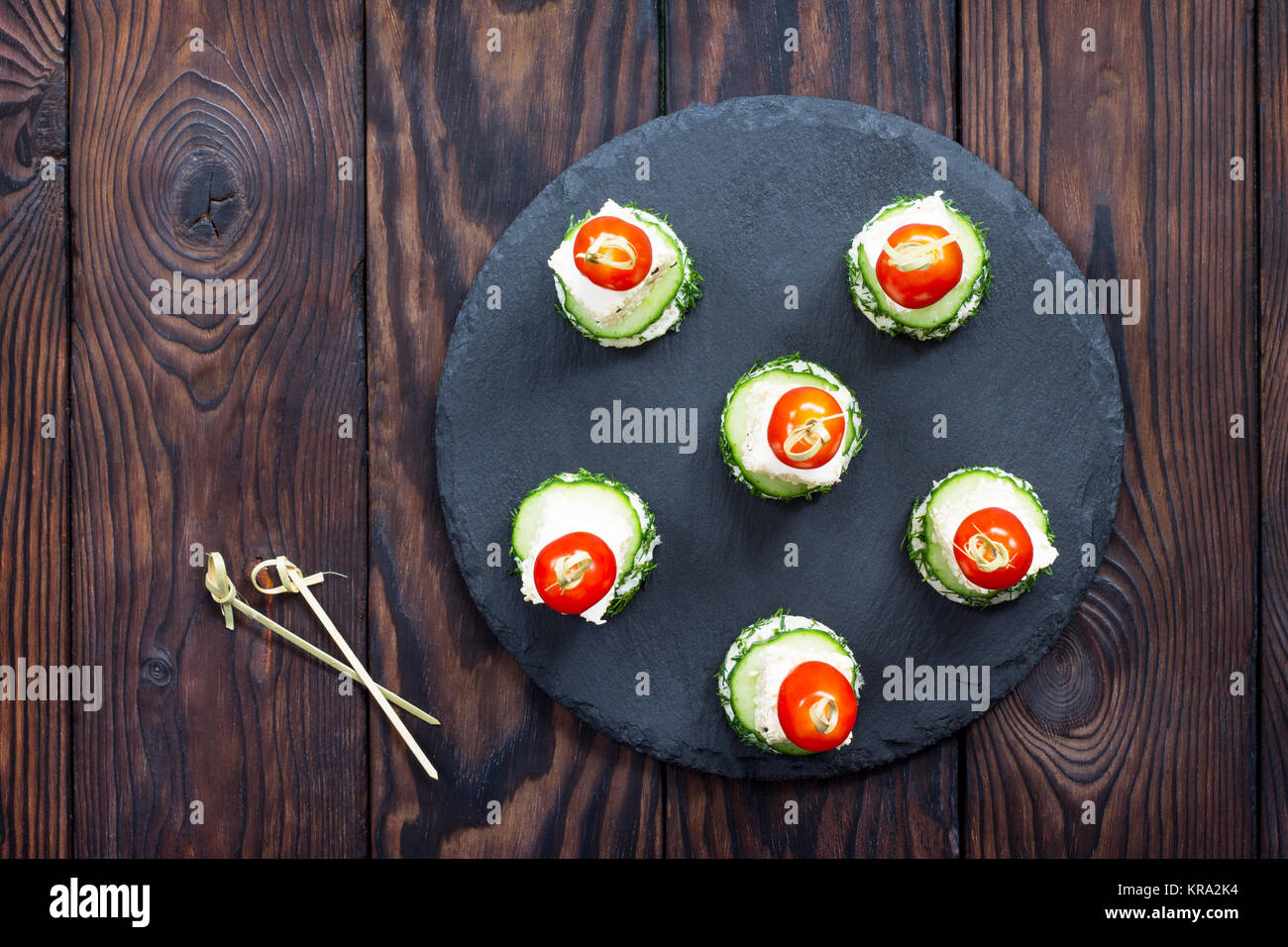 Appetizer canape with white bread, feta cheese, cucumber and cherry tomatoes on a wooden table
