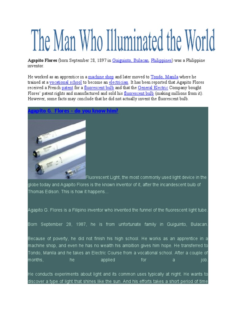 Who Invented The Fluorescent Light Bulb Did Agapito Flores Invented The Fluorescent reports claim that agapito flores had received a french patent for the fluorescent bulb through the general electric company. Benito vergara, one of the founders of the irri, claims that a certain flores did have a meeting with president manuel quezon. as our elementary and high school textbooks proudly recounted, an agapito flores, born in bulacan, invented the. Did Agapito Flores Invented The Fluorescent.