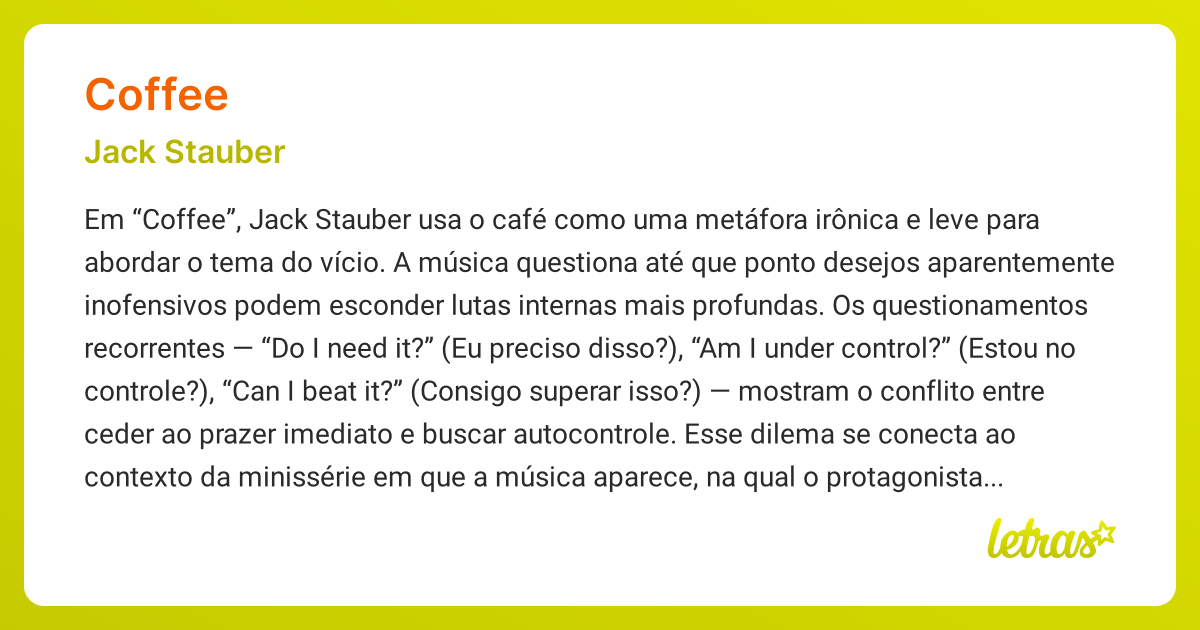 Coffee Jack Stauber A pop opera ℗ jack stauber released on: Watch jack stauber's coffee lyrics video on youtube, featuring the song from his micropop shop: Provided to youtube by ditto music coffee · jack stauber's micropop shop: The lyrics and video invite the listener to unpack the enigmatic brew of emotions and reflect on their own choices and habits. A pop opera. Coffee Jack Stauber.