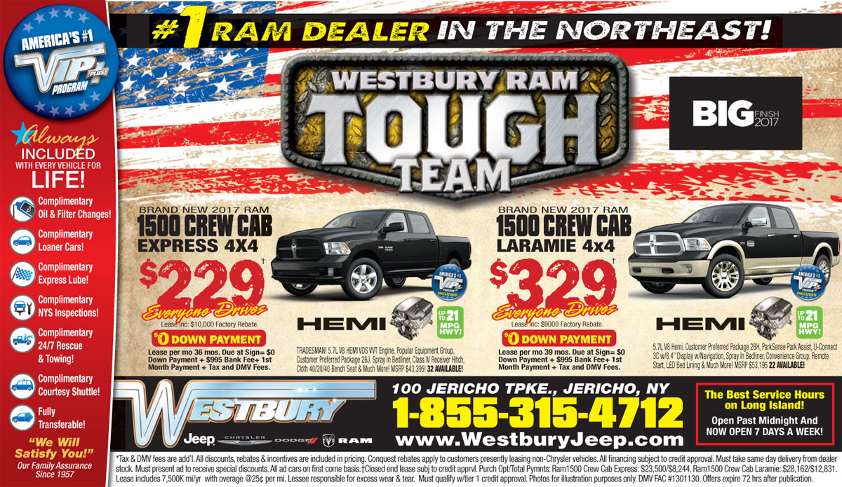 WestburyRamNewspaperAd Westbury Deals Westbury Deals nissan lease and finance specials in westbury, ny. Looking to lease or buy, you are guaranteed a great. westbury jeep chrysler dodge ram has the best deals in long island, ny on all ram models. jeep deals, specials, & coupons at westbury jcdr on long island, ny. Check out our specials page and you'll see periodic updates. Westbury Deals.
