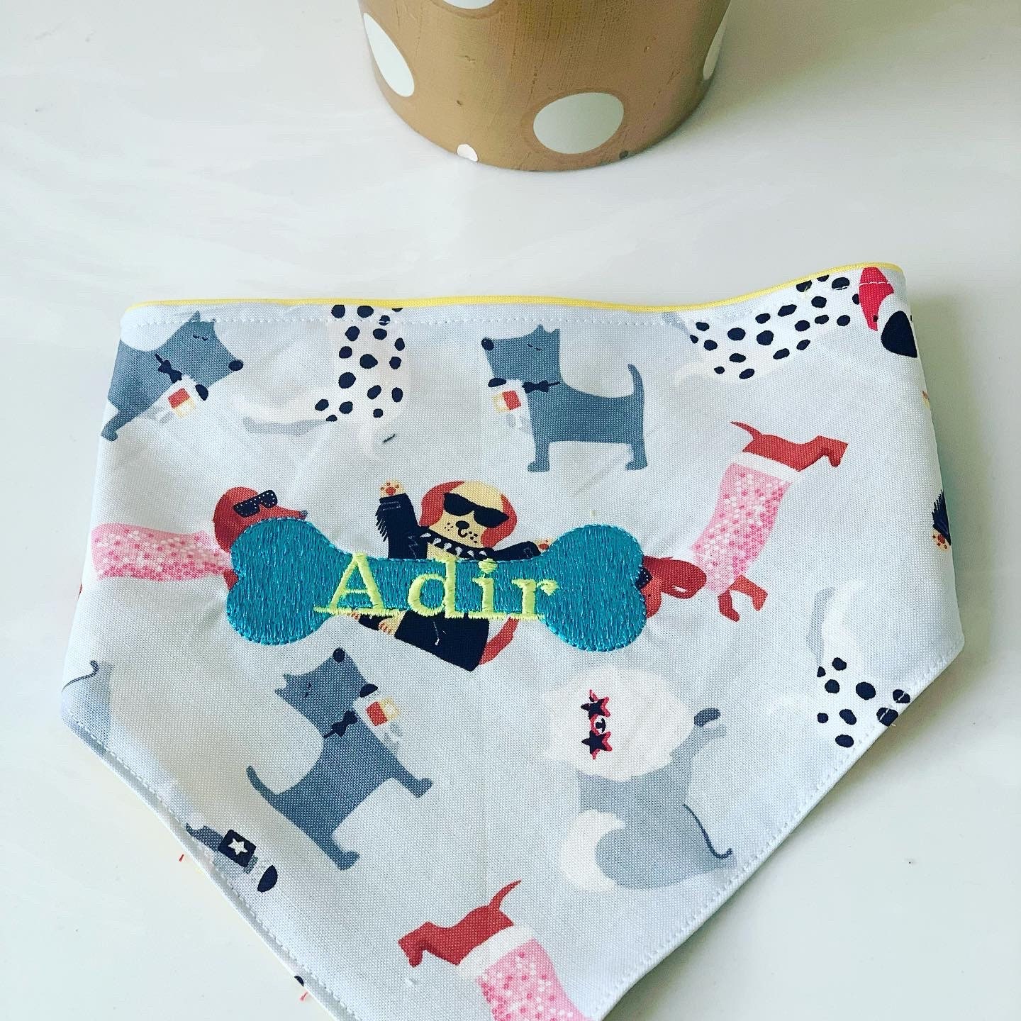 Free Dog Bandana Pattern This bandana is made by creating a tunnel which you can easily thread your dogs collar through. This beginner sewing project is a great way to use up fabric scraps! This makes it easy to take on and off, and also swap for different colours and fabrics depending on the occasion. Great for a kids crafts! Fun, fast & easy. Free Dog Bandana Pattern.