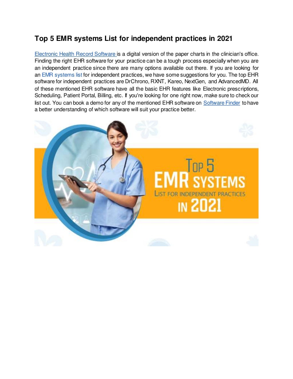 Top 5 emr systems list for independent practices in 2021 Top 5 Emr Companies Compare top emr systems leaders. Electronic medical records features reviewers most value. Best for mobile ehr and vendor info: Here are our picks for the top emr systems: Best for ease of use; Top 5 Emr Companies.