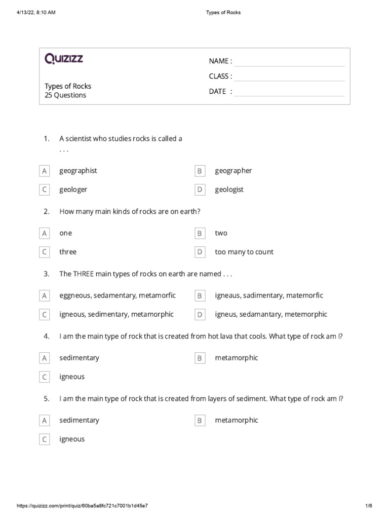 Types Of Rocks Quiz Worksheet Education Com Earth Sci vrogue.co Types Of Rocks Quiz Pdf 2) magma and lava are both molten (melted) rock. What is the difference between them? Select and download free lesson resources, including slide decks, worksheets and quizzes A pdf file with 10 multiple choice questions about the rock cycle and its processes. About how many different types of minerals are there on earth? Which table correctly classifies each rock type?. Types Of Rocks Quiz Pdf.