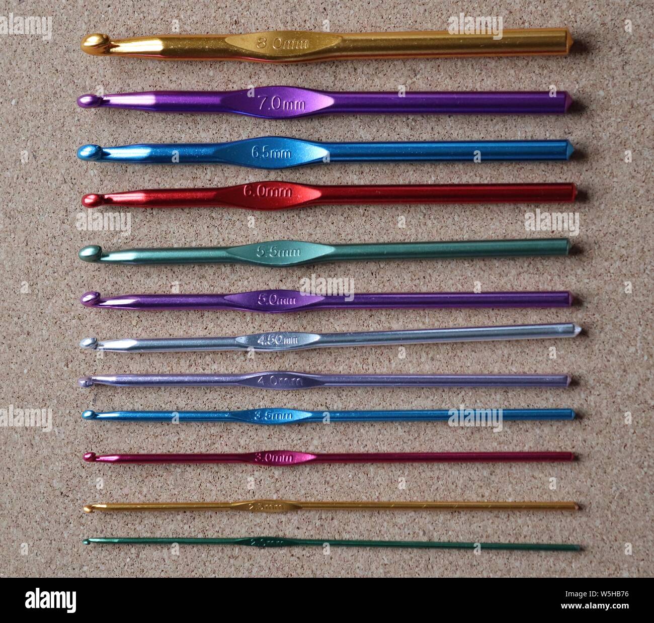 Crochet hooks made of metal in various sizes and colours Stock Photo
