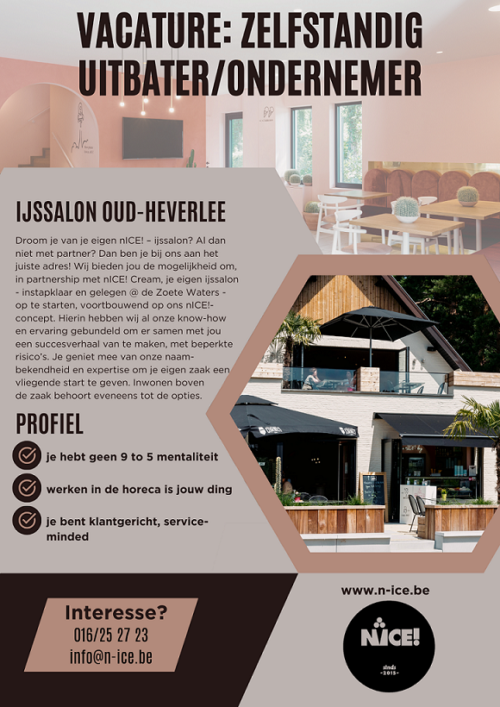 Oude cafetaria Zoete Waters ruimt plaats voor iets nieuws (OudHeverlee Nice Oud-Heverlee Openingsuren Actuele bedrijfsinformatie van ijssalon nice! Zaterdag en zondag geopend van 12 tot 22 uur. Open van maandag tot vrijdag van 13 tot 22 uur. Hip & trendy ice cream parlor where you can enjoy delicious ice cream and sorbets under a palm tree with a beautiful view over the freshwater ponds. 7/7 beschikbaar, mits reservatie vooraf; The interior takes you. Nice Oud-Heverlee Openingsuren.