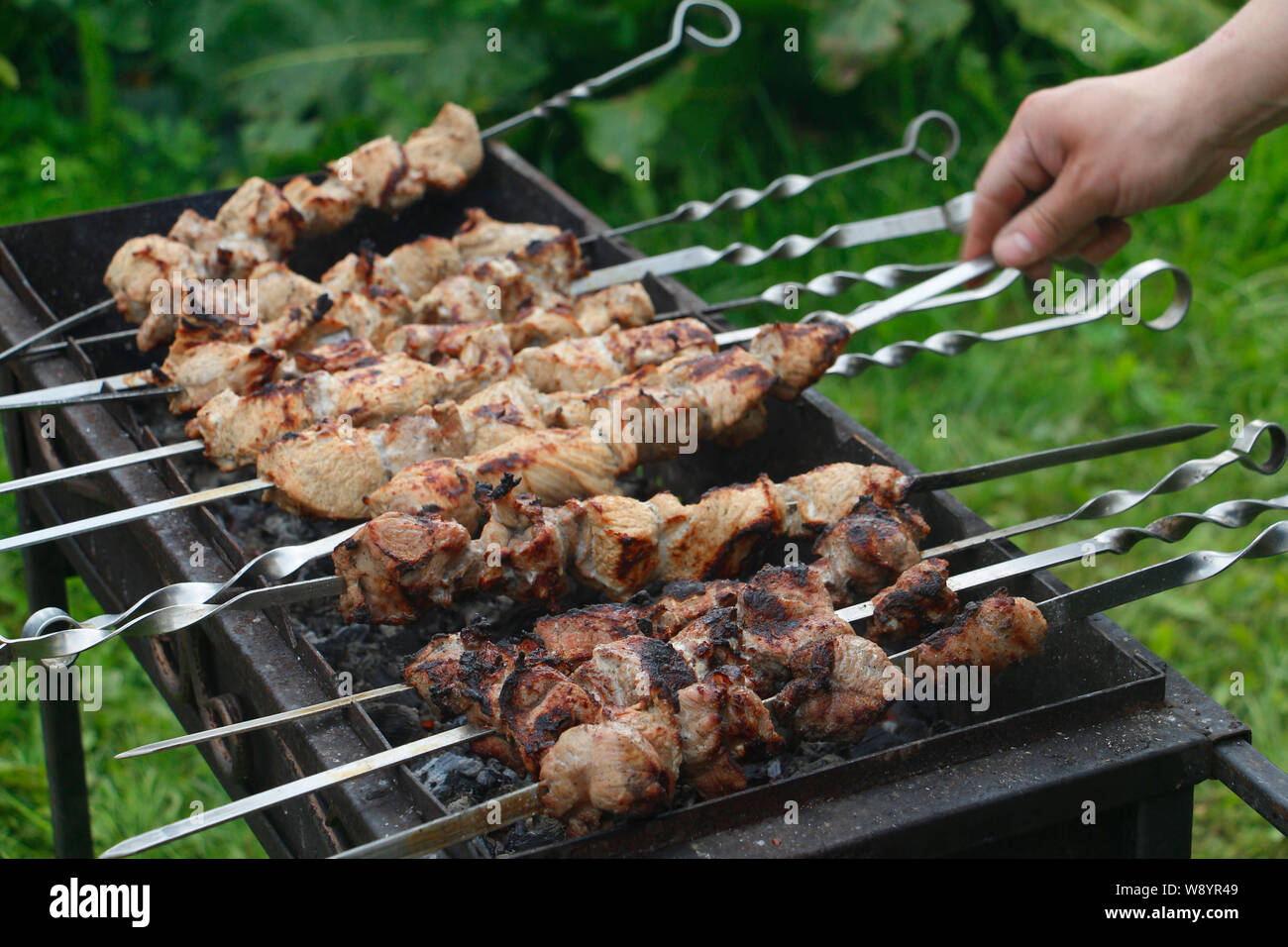 Cook cooks barbecue skewers. Marinated kebab is grilled on charcoal