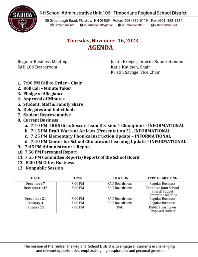 School Board Agenda 11 16 23 Timberlane Regional School District
