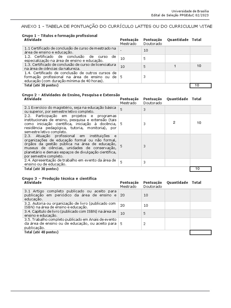 Anexo 1 Tabela de Pontuação Do Currículo Lattes Ou Do Curriculum