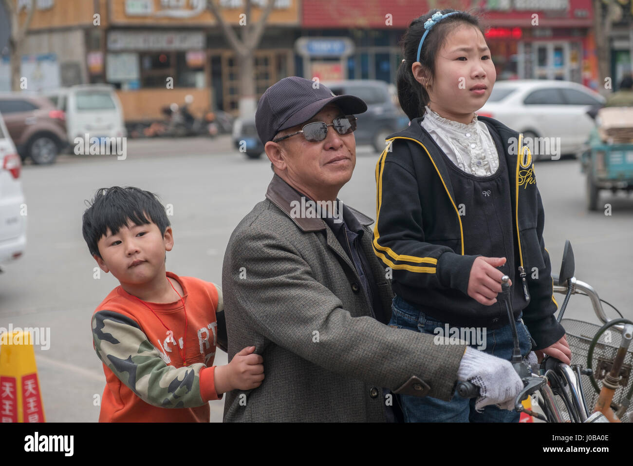A sister and brother with their grandfather in Xiong County, Hebei